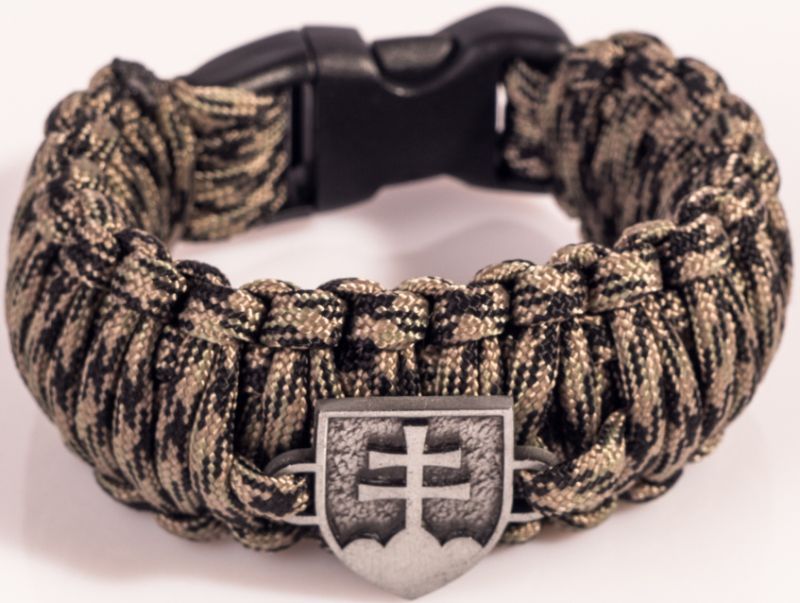 Náramok z paracord šnúry s SK znakom, ktorý slúži najmä pre pocit príslušnosti, ale v núdzi sa dá rozmotať a získa sa tým paracord, použiteľný pre rôzne núdzové situácie.