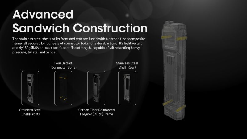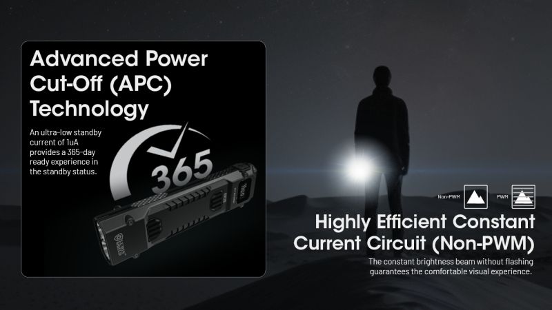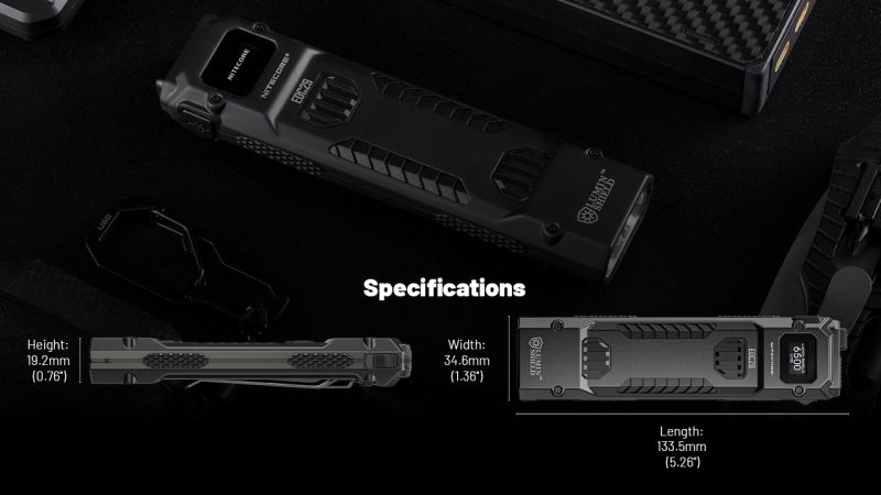 Taktické svietidlo s digitálnym displejom používa vysoko kvalitné LED diódy 2 x NiteLab UHi 20 MAX. Maximálny výkon až 6500 lúmenov. Vysoko efektívna elektronika. Maximálna prevádzková doba až do 61 hodín. Inteligentný nabíjací obvod s detekciou napätia, nabíja bezpečne a rýchlo. Integrovaná zásuvka USB-C je odolná voči vode, prachu a nárazu.