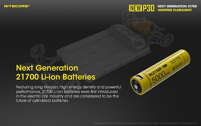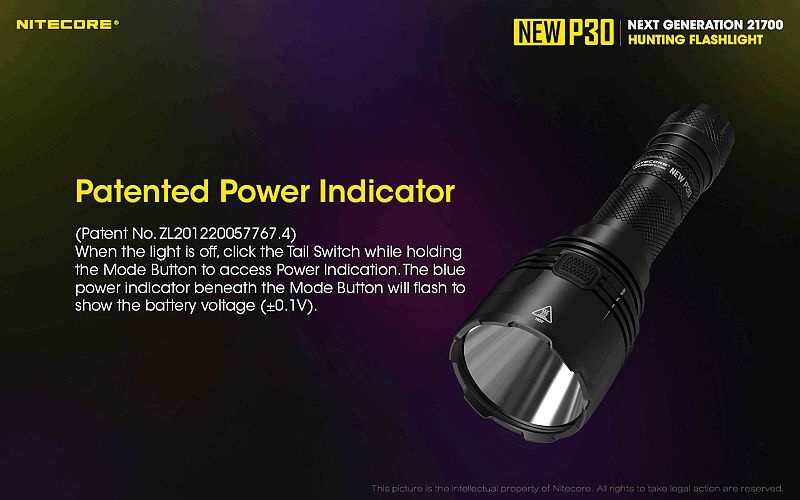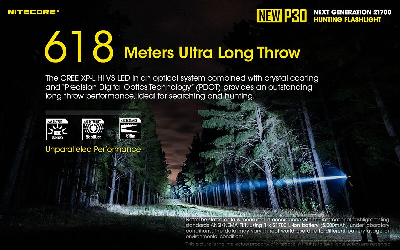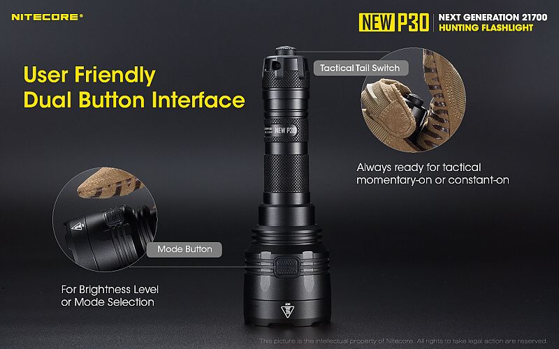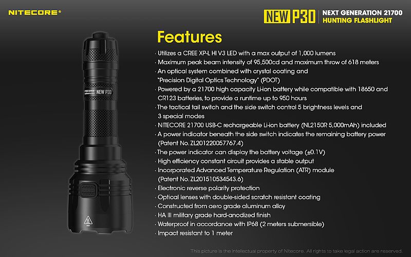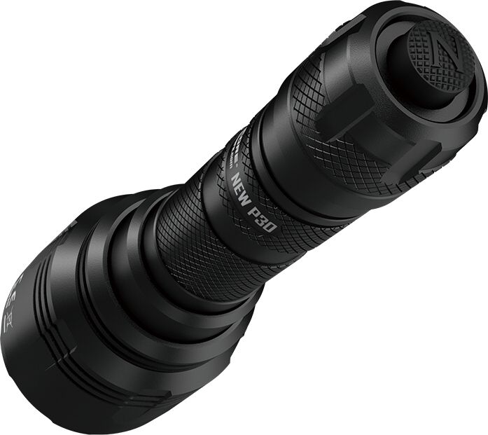 Kompaktné svietidlo P30 s veľkou hlavou 50 mm poskytuje pôsobivý dosah 618 m. P30 používa dve batérie CR123 na maximálny výkon 1 000 lumenov a 5 celkových úrovní svietenia(1 000 / 400/220/70/1 lumenov). Voliteľné použitie s batériou 18650. Zadný vypínač, bočný spínač na zmenu režimu a indikátor zvyškového napätia. Súčasťou balenia sú 2 batérie.