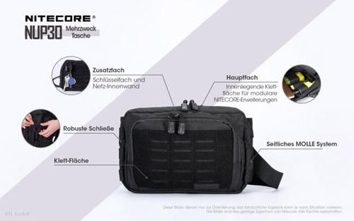 Taška môže byť použitá samostatne s nastaviteľným ramenným popruhom alebo ako modulárne rozšírenie na väčší batoh, napríklad Nitecore BP25. Výhodou sú aj vysoko kvalitné YKK zipsy, ktoré zabezpečujú dlhú životnosť a spoľahlivosť.