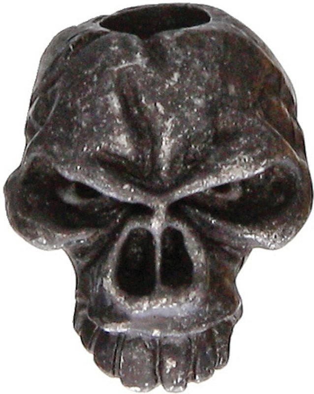 Čierna zoxidovaná lebka, ktorá slúži ako ozdoba na paracordový náramok alebo na paracordovú rukoväť noža.