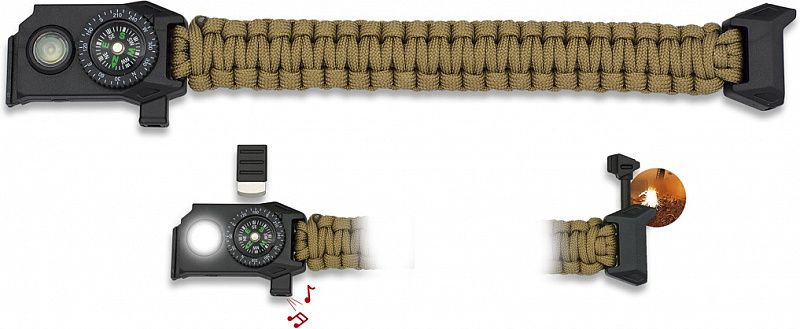 Paracord náramok s kresadlom, kompasom, píšťalkou a svetlom v coyote farbe.