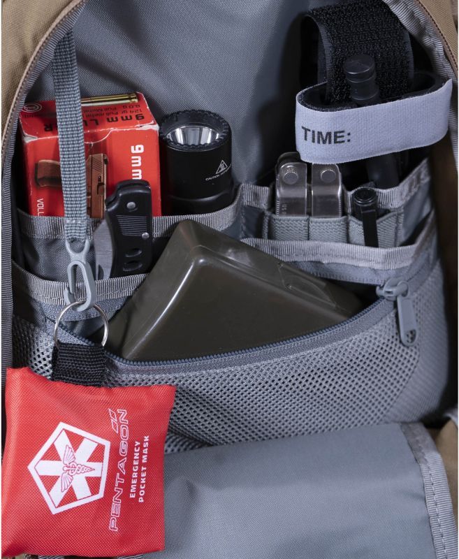 Na čelnej strane nájdete štyri rady univerzálnej MOLLE/PALS väzby, ktorú je možné použiť na pripevnenie sumiek či iného kompatibilného vybavenia. Za väzbou sa nachádza priehradka prístupná cez dvojcestný YKK® zips opatrený mohutnými hmatníkmi. Vo vnútri vrecka je organizér obsahujúci niekoľko menších vreciek a karabínku na zavesenie kľúčov. Na veku batoha je umiestnený suchý zips vhodný pre vaše VELCRO nášivky a vnútorné vrecko veka je podšité mäkkým flaušom.
