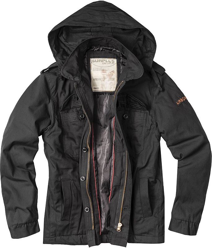 Látková jarno-jesenná bunda od nemeckej firmy Surplus. Zapínanie bundy je riešené pomocou kovového zipsu, cez tento zips je prekrytý golier s gombíkmi. Surplus Airborne Jacket má aj podšívku (nie je odopínateľná). Na jednom z rukávov je tiež nášivka AIRBORNE.