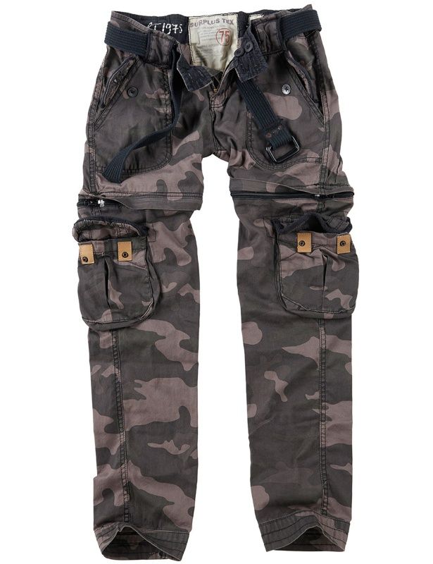 Dámsky model s úzkym strihom od Surplusu. Konce nohavíc je možné zipsom oddeliť a vzniknú nám tak slušivé dámske kraťasy. Nohavice majú veľký počet vreciek a sú vyrobené zo super jemného materiálu, ale majú použitý a opraný vzhľad. Pevný, bavlnený opasok je súčasťou dodávky, spodná časť patentiek u vreciek je spevnená koženými podložkami.