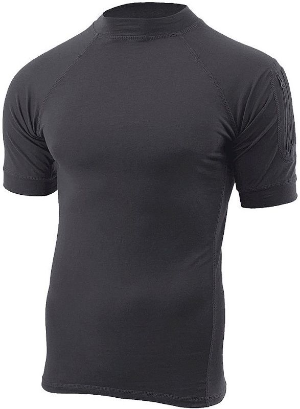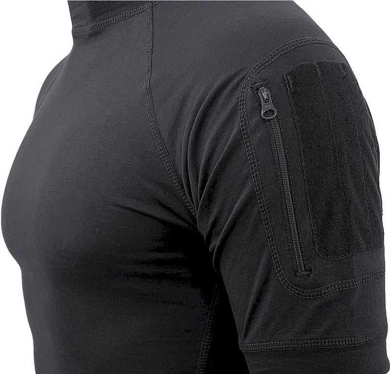 Pohodlné tričko s vysokým golierom a krátkymi rukávmi v čiernej farbe. Vyrobené z kombinácie bavlny a spandexu. Materiál je elastický, príjemný na dotyk, ľahký a priedušný. Na rukáve je našité malé vrecko na YKK zips. Na ľavom ramene je tiež panel na suchý zips, na ktorý možno pripevniť nášivku. Tričko je vybavené mäkkou páskou okolo krku, ktorá zabraňuje odieraniu krku a nadmernému vyťahovaniu.
