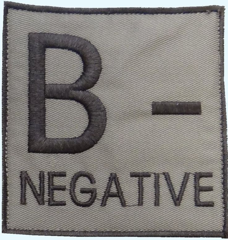 Textilná nášivka s označením krvnej skupiny B NEG a pripevnením na suchý zips. Nášivka sa môže ľahko aplikovať na oblečenie, helmu, batoh a pod.