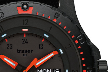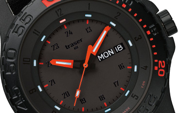 Traser Red Combat sú odolné pánske potápačské hodinky. Puzdro sa skladá z dvoch častí. Vnútorná je vyrobená z nehrdzavejúcej ocele a vonkajšia zo špeciálnej živice vystuženej sklenenými vláknami, čo zaručuje vysokú odolnosť a nízku hmotnosť hodiniek. Puzdro má priemer 45 mm a výšku 11 mm a je vybavené čiernou obojsmernou lunetou s minútovou potápačskou stupnicou. Čierny ciferník s tríciovými luminiscenčnými prvkami je krytý odolným zafírovým sklíčkom. Tríciové indexy a ručičky svietia modro, okrem indexu na 12. hodine, ktorý svieti červeno. Bezchybnú prevádzku zabezpečuje švajčiarsky quartzový strojček Ronda 517.6 DD s funkciami zobrazenia času, dátumu a dňa v týždni. Vodotesnosť hodiniek je 20 ATM.