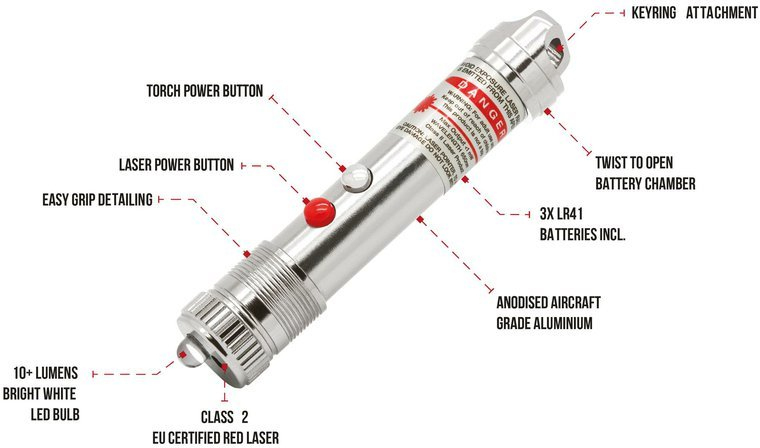 Malú praktickú baterku True Utility Laserlite TU289 možno vďaka zabudovanému krúžku na karabínu pripevniť na kľúče. Súčasťou výrobku je aj červený laser s certifikátom CE, ktorý možno použiť počas prezentácie alebo prejavu, alebo keď jednoducho potrebujete na niečo ukázať. Svietidlo je vyrobené z nehrdzavejúcej ocele. Súčasťou balenia je šesť lítiových batérií.