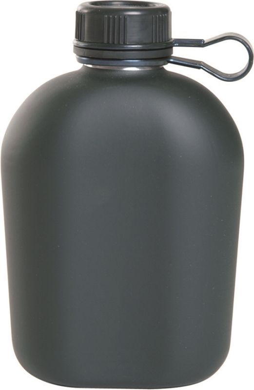 Vojenská hliníková poľná fľaša, repro fľaše používanej u US ARMY, v jednofarebnom olivovom zafarbení. Poľná fľaša je vyrobená z nehrdzavejúceho hygienicky nezávadného materiálu, je opatrená nánosom gumy s protisklzovým efektom, ktorý zároveň slúži pre uchovanie teploty mimo nádoby. Viečko je šróbovateľné, vyrobené z plastu, opatrené tesniacimi krúžkami proti prenikaniu tekutiny von.