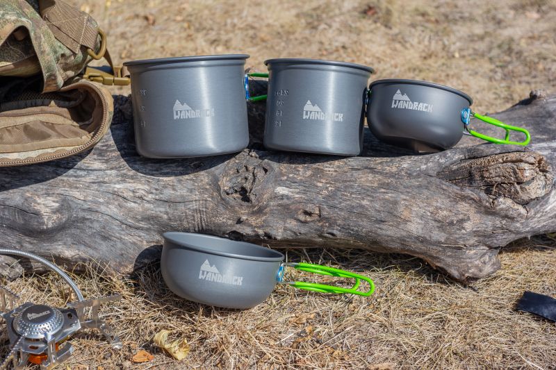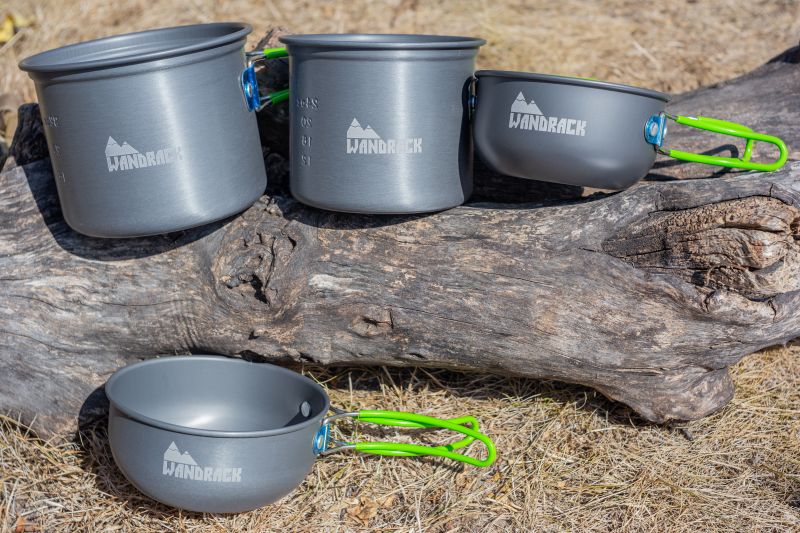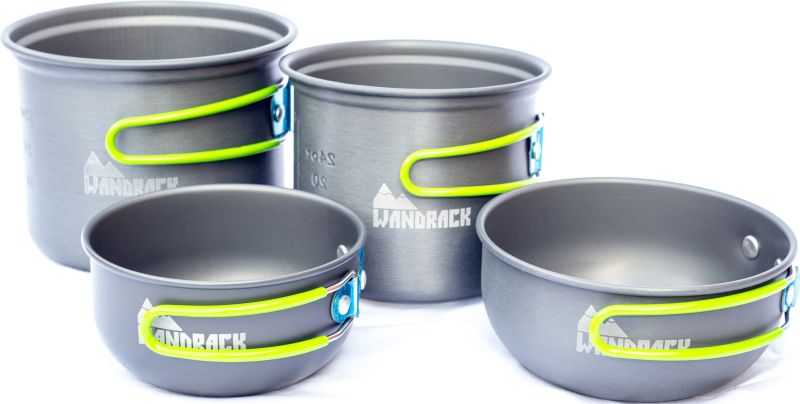 Praktický set kempingového riadu z dielne značky Wandrack. S týmto setom si pripravíte svoje obľúbené jedlá aj na vašich potulkách. Riad je vyrobený z hliníku takže je ľahký a jednoducho sa dá zložiť do seba aj vďaka sklápacím rukovätiam. Rukoväte sú potiahnuté silikónom pre bezpečnú manipuláciu bez rizika popálenia. Set obsahuje 2 hrnce a 2 panvičky v rôznych veľkostiach. Panvička sa dá použiť aj ako pokrievka na hrniec.
