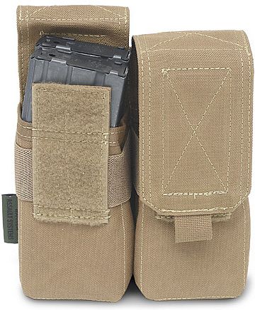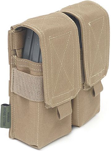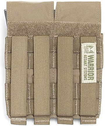 Sumka na štyri zásobníky je dvojitá, čo znamená, že zaberá miesto ako dve vrecká tzn. štyri stĺpce PALS väzby. Pásky pre uchytenie a PALS väzba na zadnej strane sumky sú samozrejmosťou. Sumku je možné uzavrieť pomocou klopy na suchý zips. Klopu tiež môžete zrolovať, alebo zastrčiť a nosiť sumku otvorenú pre rýchlu výmenu zásobníkov. Elastický pruh po obvode sumky zabezpečuje, že zásobníky nevypadnú, aj keď je sumka poloprázdna.