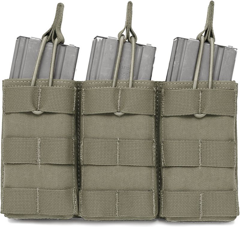 Otvorená sumka na tri zásobníky typu 5.56mm od Warrior Assault Systems. Zásobníky v sumke sú istené pomocou gumičiek, takže nevypadne a zároveň poskytuje veľmi rýchly prístup k munícii. Pásky pre uchytenie a PALS väzba na zadnej strane sumky sú samozrejmosťou.