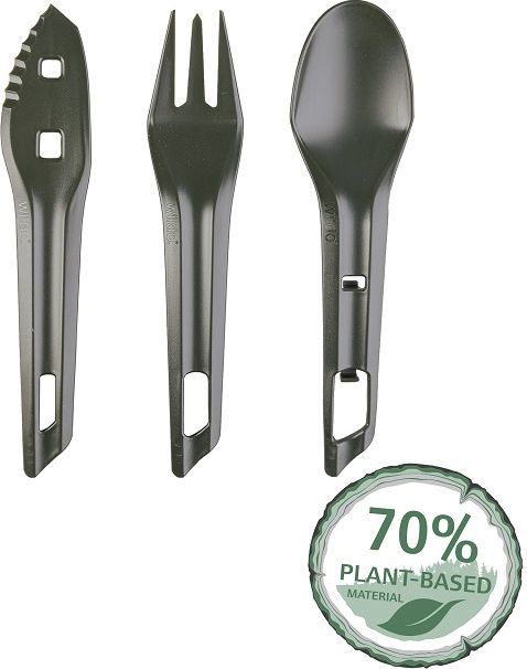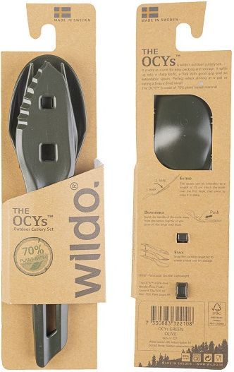 Súprava vonkajších príborov Wildo® THE OCYs™ sa skladá zo 70% z prírodného materiálu. Vyrobené vo Švédsku. Možno stohovať ako celok, čo uľahčuje balenie a skladovanie. Ostrý nôž, praktická vidlička a výsuvná lyžica (v kombinácii s nožom)